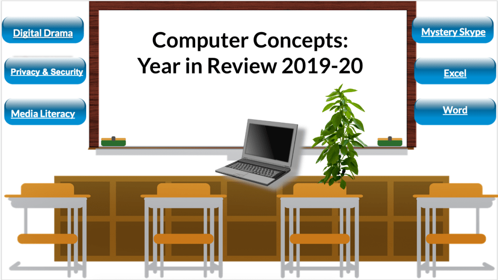 The overview of my 9th grade computer concepts course included the following topics: Digital Drama, Privacy & Security, Media Literacy, Mystery Skype, Word and Excel.
